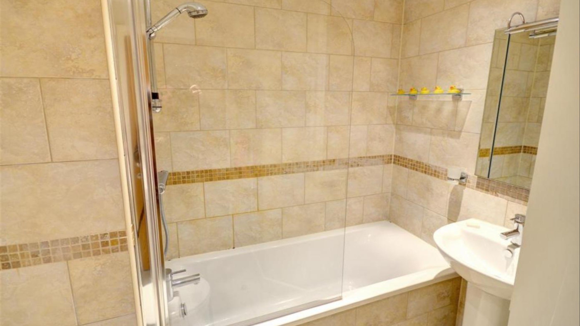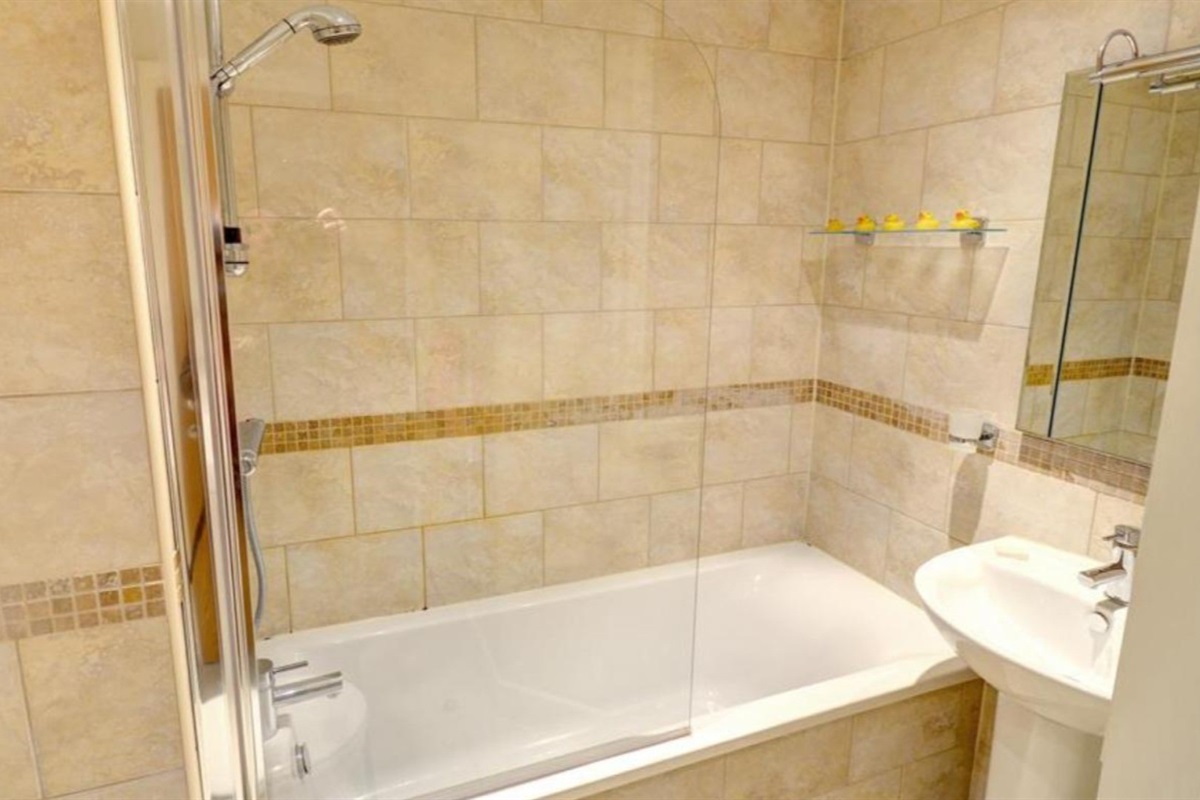 Family Bathroom : Bath with shower head, toilet & washbasin