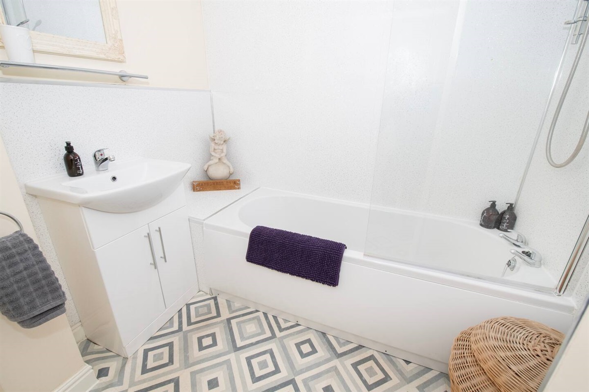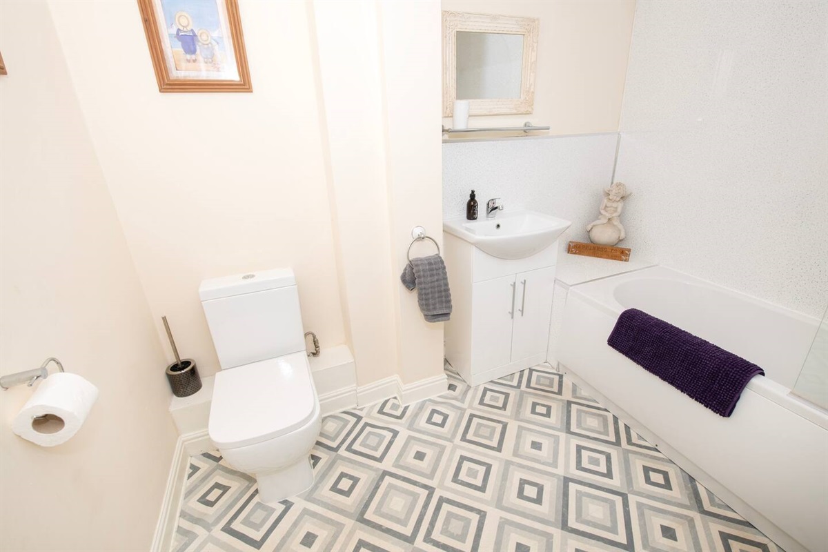 Family Bathroom : Bath with shower head, toilet & washbasin